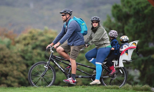 A family goes for a bike ride on the outskirts of Wellington, New Zealand on Monday. The country will ease a nationwide COVID-19 lockdown next week after claiming success in stopping "an uncontrolled explosion" of the virus, Prime Minister Jacinda Ardern said Monday. Photo: AFP