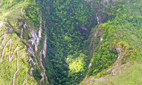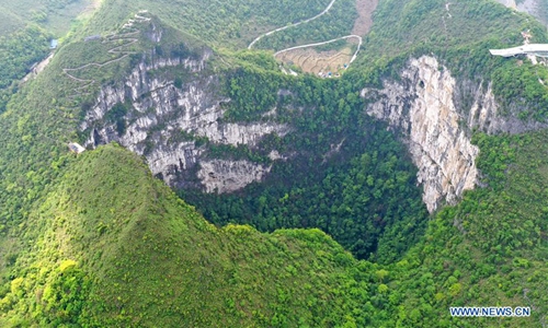 Aerial Photo taken on April 19, 2020 shows the scenery of Dashiwei Tiankeng, a giant karst sinkhole, at Leye-Fengshan Global Geopark, south China's Guangxi Zhuang Autonomous Region. The Leye-Fengshan Geopark was added to the UNESCO's Global Geopark List in 2010. The geopark contains large subterranean rivers, natural bridges and extensive cave systems. (Xinhua/Zhou Hua)
