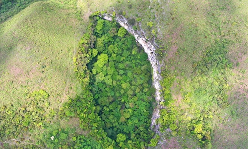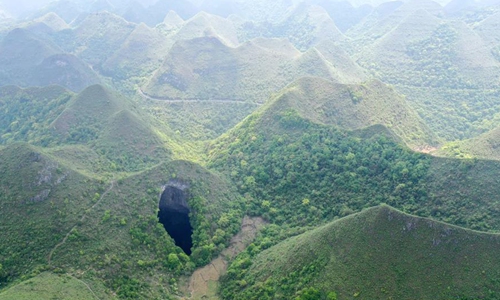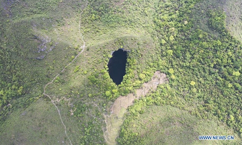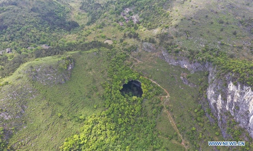 Aerial Photo taken on April 19, 2020 shows a Tiankeng, or giant karst sinkhole, at Leye-Fengshan Global Geopark, south China's Guangxi Zhuang Autonomous Region. The Leye-Fengshan Geopark was added to the UNESCO's Global Geopark List in 2010. The geopark contains large subterranean rivers, natural bridges and extensive cave systems. (Xinhua/Zhou Hua)