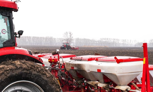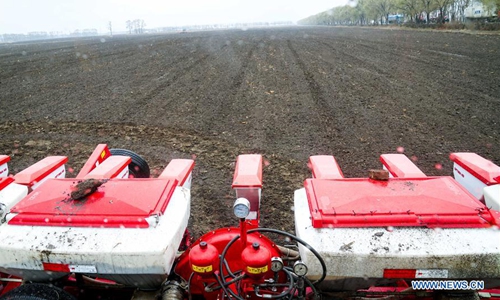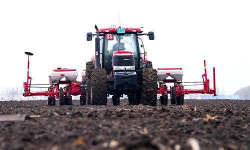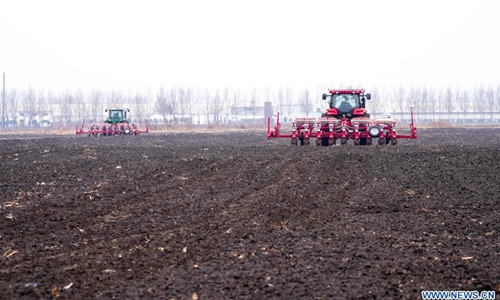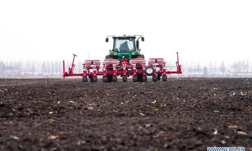A farmer drives a tractor to plant corns in the field in Shuangcheng District of Harbin, northeast China's Heilongjiang Province, April 20, 2020. Spring sowing in Heilongjiang Province has started recently. (Xinhua/Wang Song)
