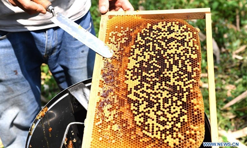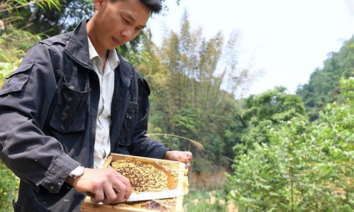 Beekeeper Ban Huafu harvests honey at Baini Village of Xinhua Town in Leye County, south China's Guangxi Zhuang Autonomous Region, April 20, 2020. In the poverty-stricken Baini village, villagers started to harvest this year's honey. The beekeeping project was carried out here as part of the poverty alleviation efforts and its yearly output value has reached about 200,000 yuan (about 28,305 U.S. dollars).Photo:Xinhua