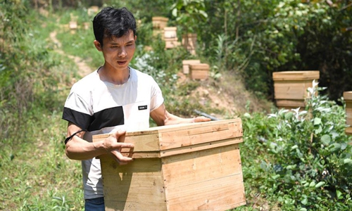 Beekeeper Ban Hualiu carries a honeybee hive box at Baini Village of Xinhua Town in Leye County, south China's Guangxi Zhuang Autonomous Region, April 20, 2020. In the poverty-stricken Baini village, villagers started to harvest this year's honey. The beekeeping project was carried out here as part of the poverty alleviation efforts and its yearly output value has reached about 200,000 yuan (about 28,305 U.S. dollars).Photo:Xinhua