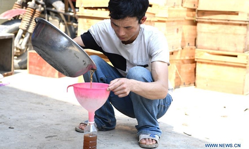 Beekeeper Ban Hualiu pours honey into a bottle at Baini Village of Xinhua Town in Leye County, south China's Guangxi Zhuang Autonomous Region, April 20, 2020. In the poverty-stricken Baini village, villagers started to harvest this year's honey. The beekeeping project was carried out here as part of the poverty alleviation efforts and its yearly output value has reached about 200,000 yuan (about 28,305 U.S. dollars).Photo:Xinhua