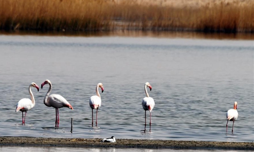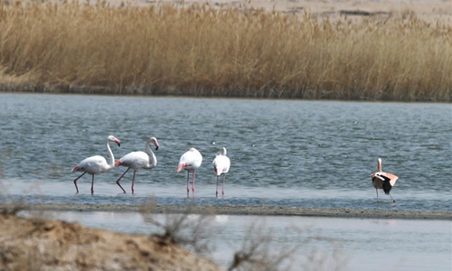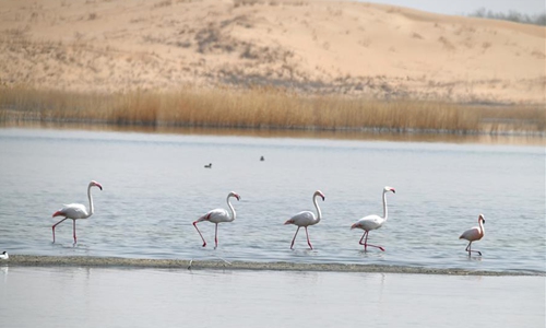 Photo taken on April 16, 2020 shows flamingos resting by a lake in the Ulan Buh Desert, north China's Inner Mongolia Autonomous Region. Photo:Xinhua