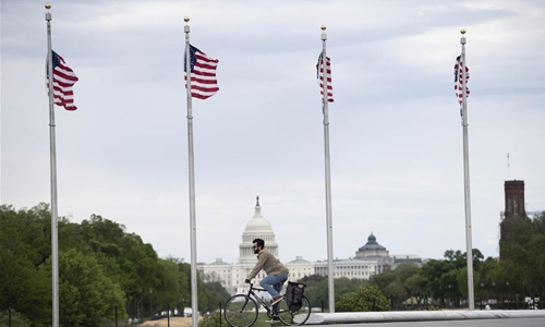 A man rides a bicycle with the U.S. Capitol Building in the background in Washington D.C., the United States, on April 21, 2020. The number of COVID-19 cases in the United States topped 800,000 on Tuesday with deaths surpassing 43,000, while Americans are increasingly divided over when and how to reopen the economy. (Xinhua/Liu Jie)