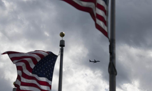 A plane flies in the sky with the U.S. national flags in the foreground in Washington D.C., the United States, on April 21, 2020. The number of COVID-19 cases in the United States topped 800,000 on Tuesday with deaths surpassing 43,000, while Americans are increasingly divided over when and how to reopen the economy. (Xinhua/Liu Jie)