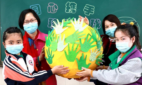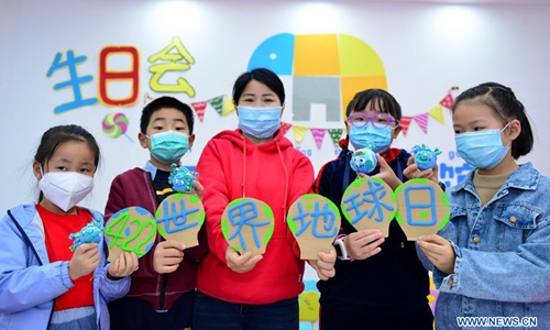 Students and their teacher show the clay works during an activity calling for the protection of the Earth and the environment at a community in Hefei, east China's Anhui Province, April 21, 2020. Earth Day, which falls on April 22 annually, aims to raise public awareness about the environment and calls for people to protect the Earth with action. (Photo by Ge Chuanhong/Xinhua)