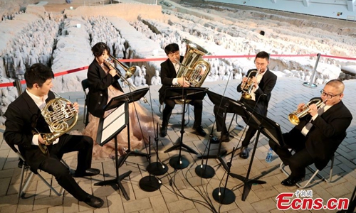A string quartet of the Xi'an Symphony Orchestra performs during a concert livestreamed on the internet in the Emperor Qinshihuang's Mausoleum Site Museum on April 22, 2020. (Photo: China News Service/Zhang Yuan)