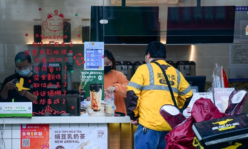 A deliveryman of Meituan Dianping, a Chinese group buying platform, waits outside a milk tea store in Wuhan on Friday, central China's Hubei Province. Restaurants and stores have gradually reopened in Wuhan after the city was on lockdown for nearly two months. Photo: IC