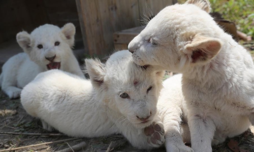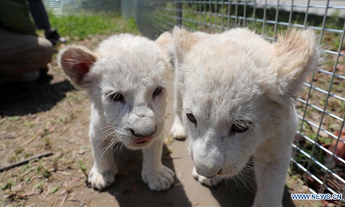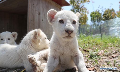 White lion cubs play outdoors at Nantong Forest Safari Park in Nantong City, east China's Jiangsu Province, April 23, 2020. The nearly two-month-old triplets make their debut at the park on Thursday and they will formally meet the tourists on May 1. (Photo by Xu Congjun/Xinhua)