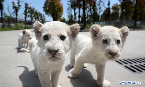 Triplets of white lion cubs play outdoors at Nantong Forest Safari Park in Nantong City, east China's Jiangsu Province, April 23, 2020. The nearly two-month-old triplets make their debut at the park on Thursday and they will formally meet the tourists on May 1. (Photo by Xu Congjun/Xinhua)