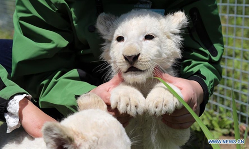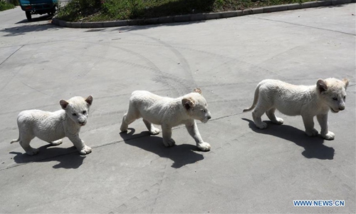 White lion cubs play with feeders outdoors at Nantong Forest Safari Park in Nantong City, east China's Jiangsu Province, April 23, 2020. The nearly two-month-old triplets make their debut at the park on Thursday and they will formally meet the tourists on May 1. (Photo by Xu Congjun/Xinhua)