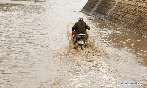 A man rides his motorcycle on a waterlogged road in Sanaa, Yemen, April 24, 2020. A heavy rain hit Sanaa on Friday. (Photo by Mohammed Mohammed/Xinhua)