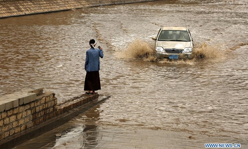 A car runs on a waterlogged road in Sanaa, Yemen, April 24, 2020. A heavy rain hit Sanaa on Friday. (Photo by Mohammed Mohammed/Xinhua)