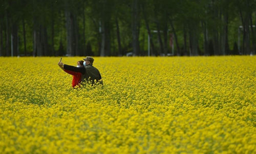 People take selfies in the cole flower fields in Guaicun Village of Wangzuo Township in Fengtai District of Beijing, capital of China, April 25, 2020. (Photo by Chen Zhonghao/Xinhua)