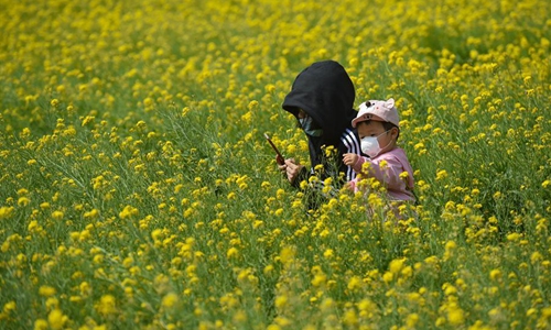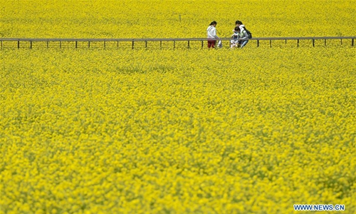 People visit the cole flower fields in Guaicun Village of Wangzuo Township in Fengtai District of Beijing, capital of China, April 25, 2020. (Photo by Chen Zhonghao/Xinhua)
