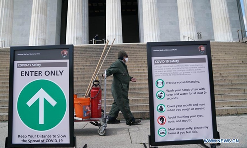 A cleaner walks by two placards reminding people of COVID-19 safety at the Lincoln Memorial in Washington D.C., the United States, on April 16, 2020. (Xinhua/Liu Jie)
