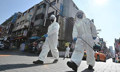 South Korean soldiers wearing protective gear spray disinfectant on the street to help prevent the spread of the COVID-19, at Gangnam district in Seoul on Thursday. South Korea’s total number of novel coronavirus cases – the largest outside China – rose above 6,000. Photo: AFP