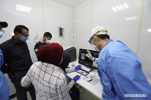 Chinese medical experts Wang Anming (C) and Ai Hexu (2nd R) train the Iraqi health workers to operate the CT scanner at a quarantine center in Baghdad, capital of Iraq, April 25, 2020. A team of Chinese medical experts completed the installation of a CT scanner at a quarantine center in Iraqi capital Baghdad, as part of China's efforts to help Iraq cope with the spread of COVID-19. (Xinhua)