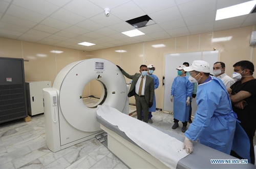 An Iraqi representative (1st L) inspects the CT scanner with Chinese medical experts at a quarantine center in Baghdad, capital of Iraq, April 25, 2020. A team of Chinese medical experts completed the installation of a CT scanner at a quarantine center in Iraqi capital Baghdad, as part of China's efforts to help Iraq cope with the spread of COVID-19. (Xinhua)