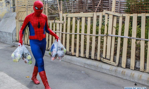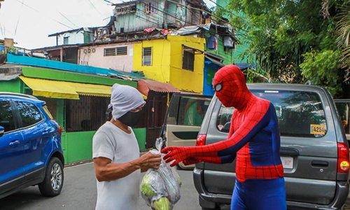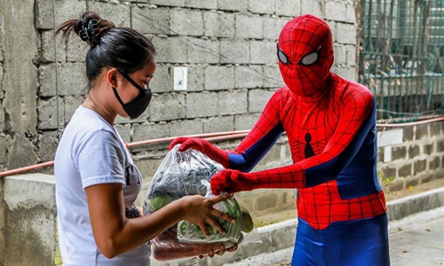 Dan Geromo wearing a Spiderman costume carries bags of vegetables for workers affected by the enhanced community quarantine in Pasig City, the Philippines, on April 25, 2020. (Xinhua/Rouelle Umali)