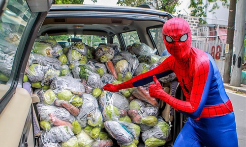 Dan Geromo wearing a Spiderman costume shows bags of vegetables for workers affected by the enhanced community quarantine in Pasig City, the Philippines, on April 25, 2020. (Xinhua/Rouelle Umali)