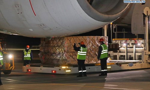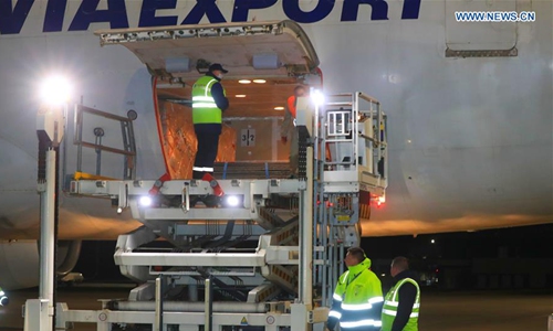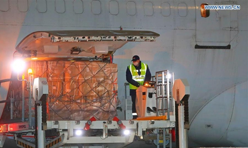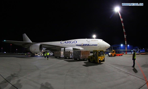 Workers unload medical supplies from China at an airport in Minsk, capital of Belarus, April 26, 2020. A cargo plane carrying medical supplies from China arrived in Belarus on Sunday, which will help the country fight COVID-19, the health ministry said. (Photo by Henadz Zhinkov/Xinhua)