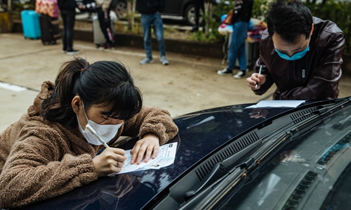 Job seekers fill in application forms in front of the Lenovo company in Wuhan on April 19. Photo: Li Hao/GT