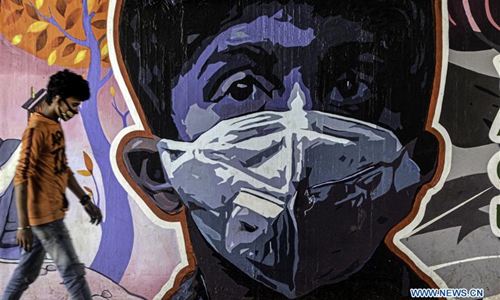 A man walks past a graffiti depicting the importance of wearing a face mask, as an attempt to raise awareness during a nationwide lockdown to slow the spread of COVID-19, in Mumbai, India, April 26, 2020. (Str/Xinhua)