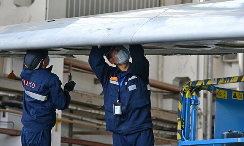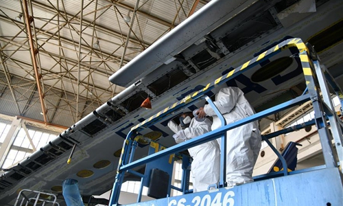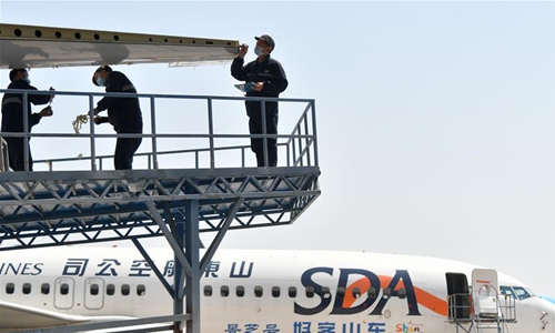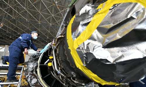Technicians check an aeroengine of a plane at Taikoo (Shandong) Aircraft Engineering Company Limited (STAECO) in Jinan, east China's Shandong Province, April 27, 2020. The COVID-19 pandemic has led to a significant decrease in airline travel and passenger revenue. Since its production recovered on Feb. 10, STAECO has been offering Passenger-to-Freighter (PTF) solutions for airline operators which need more cargo planes to address this market change. So far, the company has accomplished three PTF conversions for its clients. (Xinhua/Zhu Zheng)