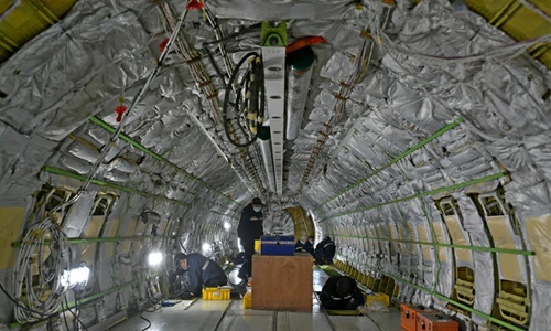 Technicians refit an airliner at Taikoo (Shandong) Aircraft Engineering Company Limited (STAECO) in Jinan, east China's Shandong Province, April 27, 2020. The COVID-19 pandemic has led to a significant decrease in airline travel and passenger revenue. Since its production recovered on Feb. 10, STAECO has been offering Passenger-to-Freighter (PTF) solutions for airline operators which need more cargo planes to address this market change. So far, the company has accomplished three PTF conversions for its clients. (Xinhua/Zhu Zheng)