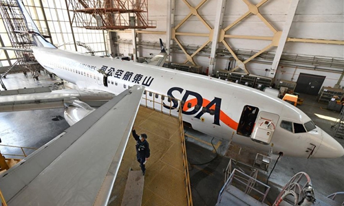 A technician refits an airliner at Taikoo (Shandong) Aircraft Engineering Company Limited (STAECO) in Jinan, east China's Shandong Province, April 27, 2020. The COVID-19 pandemic has led to a significant decrease in airline travel and passenger revenue. Since its production recovered on Feb. 10, STAECO has been offering Passenger-to-Freighter (PTF) solutions for airline operators which need more cargo planes to address this market change. So far, the company has accomplished three PTF conversions for its clients. (Xinhua/Zhu Zheng)