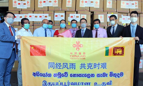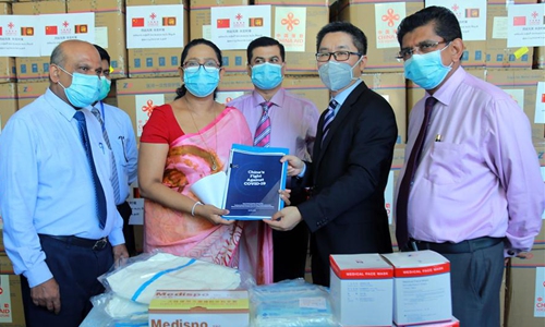 Chinese Embassy Charge d'affaires Hu Wei (2nd R) and Sri Lankan Health Minister Pavithra Wanniarachchi (front, 2nd L) attend the handover ceremony of medical aid from China in Colombo, Sri Lanka, April 27, 2020. China on Monday donated another batch of medical aid to Sri Lanka to support the island country in its battle against COVID-19. The medical aid included 20,000 test kits, 10,000 personal protective equipment (PPEs), and 110,000 facial masks, among others. (Photo by Ajith Perera/Xinhua)