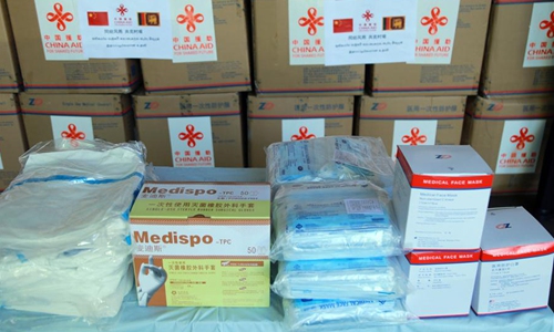 Photo taken on April 27, 2020 shows a part of the medical aid donated by China to Sri Lanka at a handover ceremony in Colombo, Sri Lanka. China on Monday donated another batch of medical aid to Sri Lanka to support the island country in its battle against COVID-19. The medical aid included 20,000 test kits, 10,000 personal protective equipment (PPEs), and 110,000 facial masks, among others. (Photo by Ajith Perera/Xinhua)