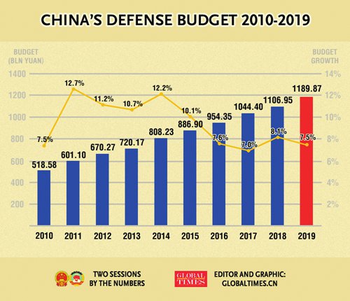 China's defense budget for 2019 was 1.1899 trillion yuan, up 7.5 percent from 2018, according to information made public at the second session of the 13th National People's Congress in March 2019. China has maintained single-digit growth in its annual defense budget since 2016.