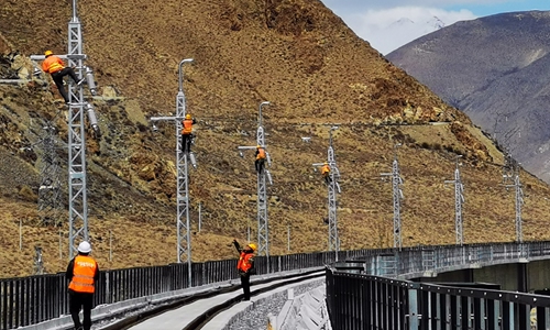 Workers operate catenary equipment for the Lhasa-Nyingchi railway project on Monday in Southwest China's Tibet Autonomous Region. Tibet's first electric railway has a designed speed of 160 kilometers per hour. More than 20,000 employees have been working on the railway since the end of 2014. It is expected to be completed and put into operation in 2021. Photo: cnsphotos