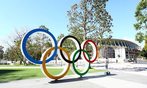 Olympic rings are displayed at Japan Sport Olympic Square near national stadium in Tokyo, Japan on March 24. Photo: VCG