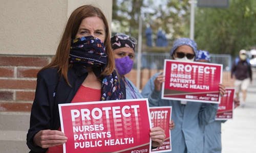 US medical professionals gather to protest for personal protective equipment at UCLA Medical Center in Santa Monica, California on Monday local time as the mounting infections have strained the country's medical resources and cause tensions between hospitals and medics. The US reported 580,000 infections as of Tuesday, highest in the world. Photo: cnsphoto