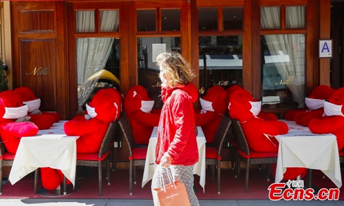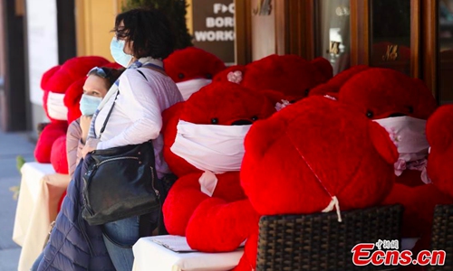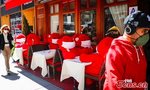 Photo taken on April 28, 2020 show Teddy bears wearing protective masks sitting at a restaurant in New York city, U.S. (Photo/China News Service)