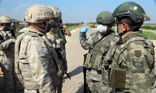 Soldiers are seen during a Turkish-Russian land patrol on M-4 highway in northwestern Idlib province of Syria, on April 28, 2020. Turkish and Russian troops on Tuesday held their sixth joint patrol along key M-4 highway in northwestern Idlib province of Syria, Turkish Defense Ministry said. (Xinhua)
