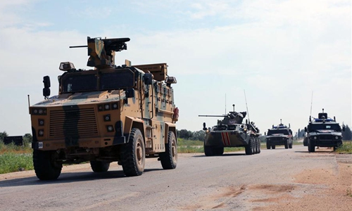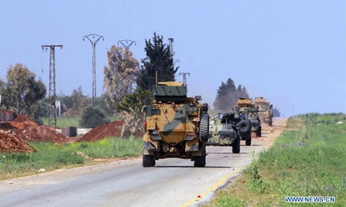 Military vehicles are seen during a Turkish-Russian land patrol on M-4 highway in northwestern Idlib province of Syria, on April 28, 2020. Turkish and Russian troops on Tuesday held their sixth joint patrol along key M-4 highway in northwestern Idlib province of Syria, Turkish Defense Ministry said. (Xinhua)