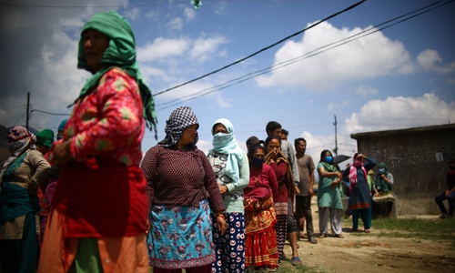 Villagers stand in a queue, waiting for their turn to get food relief packages provided by Nepal Overseas Chinese Business Association at Bungamati in Lalitpur, Nepal, April 29, 2020. (Xinhua/Sulav Shrestha)