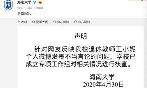 Hainan University launched an investigation on Wang Xiaoni, a retired professor from the College of Humanities and Communication, for alleged improper comments online, the university said on China's Twitter-like Sina Weibo Thursday.