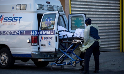 Medical workers carry a patient into an ambulance in New York, the United States, April 6, 2020. (Photo by Michael Nagle/Xinhua)