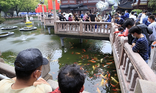 Visitors watch fish swimming in a pond in Yu Garden, an extensive Chinese garden located in Shanghai on Friday. Photo: Yang Hui/GT