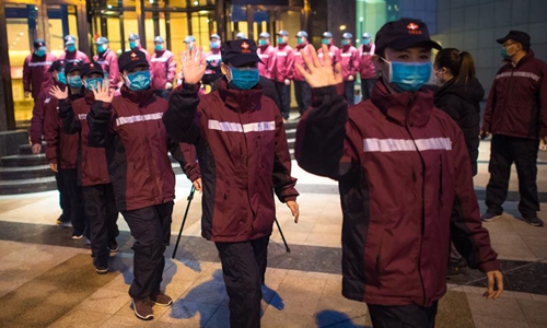 Medics from northwest China's Shaanxi Province wave goodbye before their departure in Wuhan, central China's Hubei Province, March 17, 2020. At about 7 a.m. Tuesday, 43 medics from northwest China's Shaanxi Province left Wuhan on nine buses. The first batch of medics have been scheduled to depart Hubei, once the hard-hit province of the novel coronavirus, on Tuesday, as the epidemic situation has been greatly eased. The 3,675 medical staffers belonging to 41 medical teams from across China have assisted 14 temporary hospitals and seven designated hospitals in Wuhan, the provincial capital and epicenter of the outbreak. (Xinhua/Xiao Yijiu)