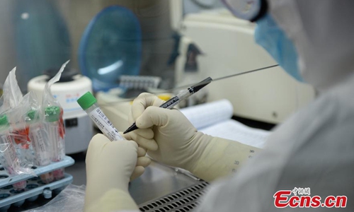 A doctor records information of patients’ throat swabs samples at a laboratory department of Shanxi Bethune Hospital in Taiyuan, capital of North China's Shanxi Province. Photo:China News Service