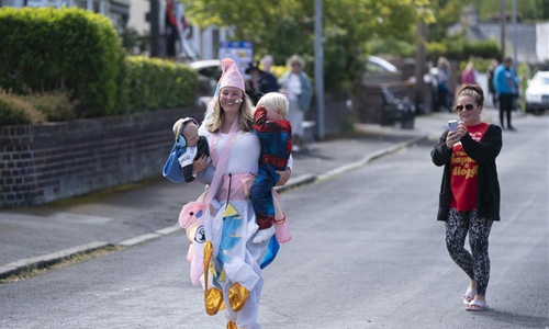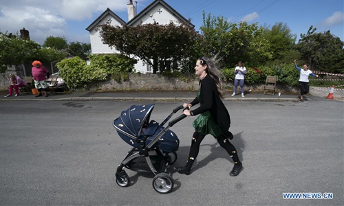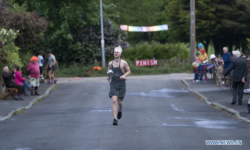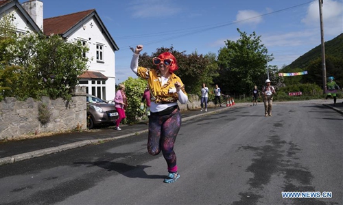 People take part in a marathon in an effort to raise funds for PPE (Personal Protective Equipment) for medical workers in local hospitals and nursing homes, in Prestatyn, north Wales, Britain, on May 1, 2020. (Photo by Jon Super/Xinhua)