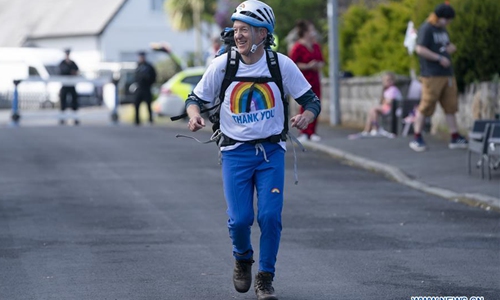 A man takes part in a marathon in an effort to raise funds for PPE (Personal Protective Equipment) for medical workers in local hospitals and nursing homes, in Prestatyn, north Wales, Britain, on May 1, 2020. (Photo by Jon Super/Xinhua)