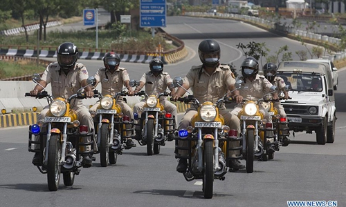Indian policemen on motorcycles pay tribute to doctors, nurses and police personnel who battle against COVID-19 pandemic in New Delhi, India, May 3, 2020. (Photo by Javed Dar/Xinhua)
